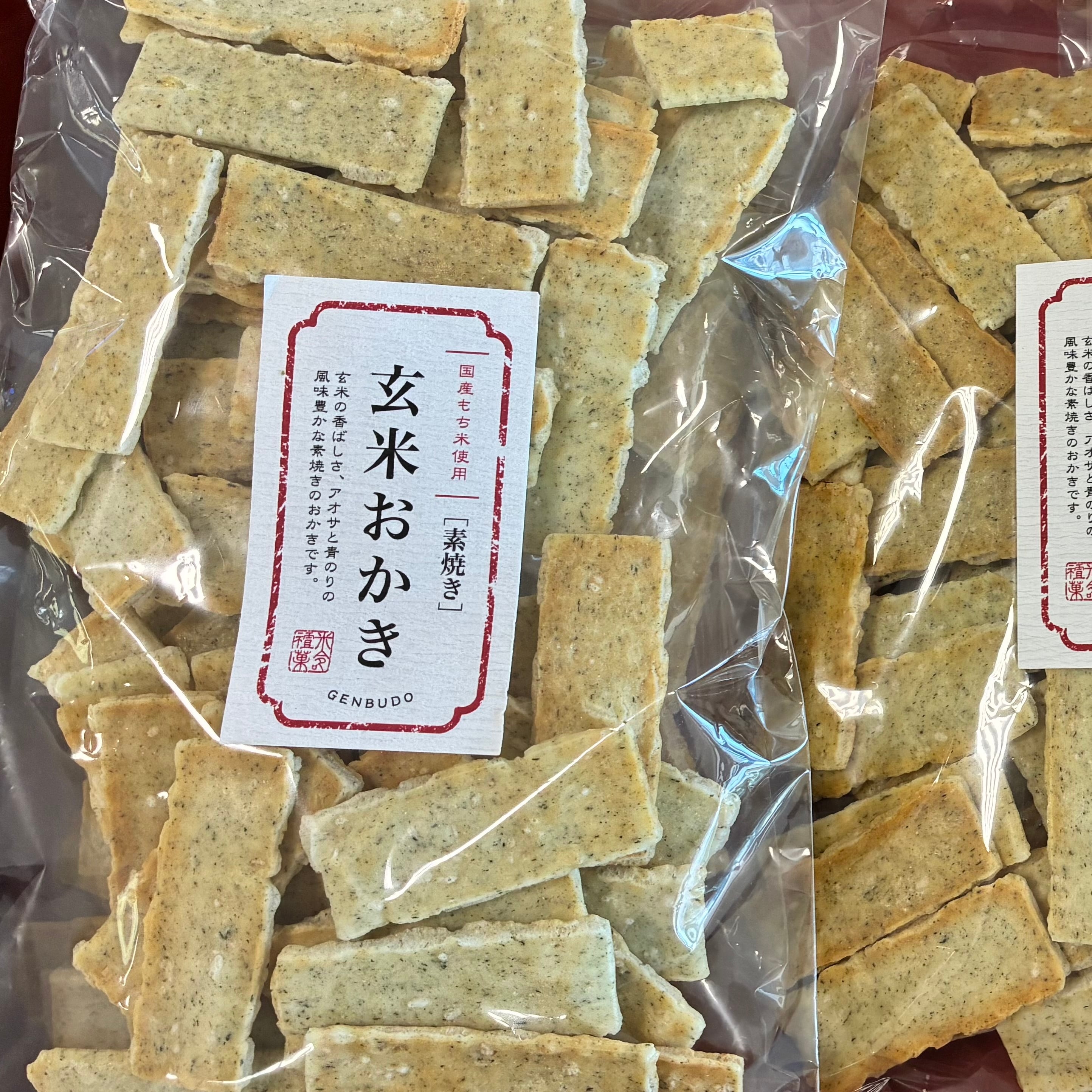 玄米の香ばしさ、アオサと骨のりの風味豊かな素焼きのおかきです。