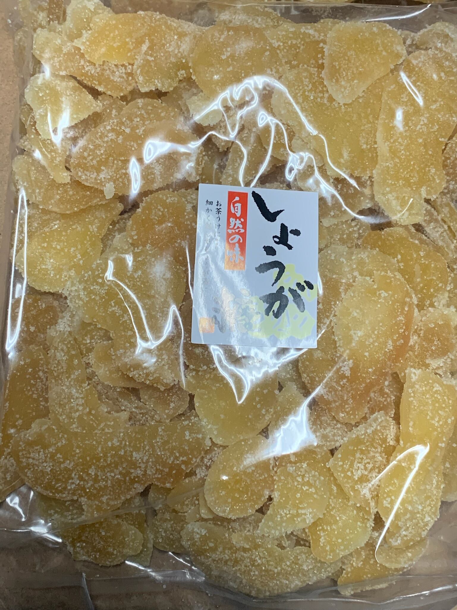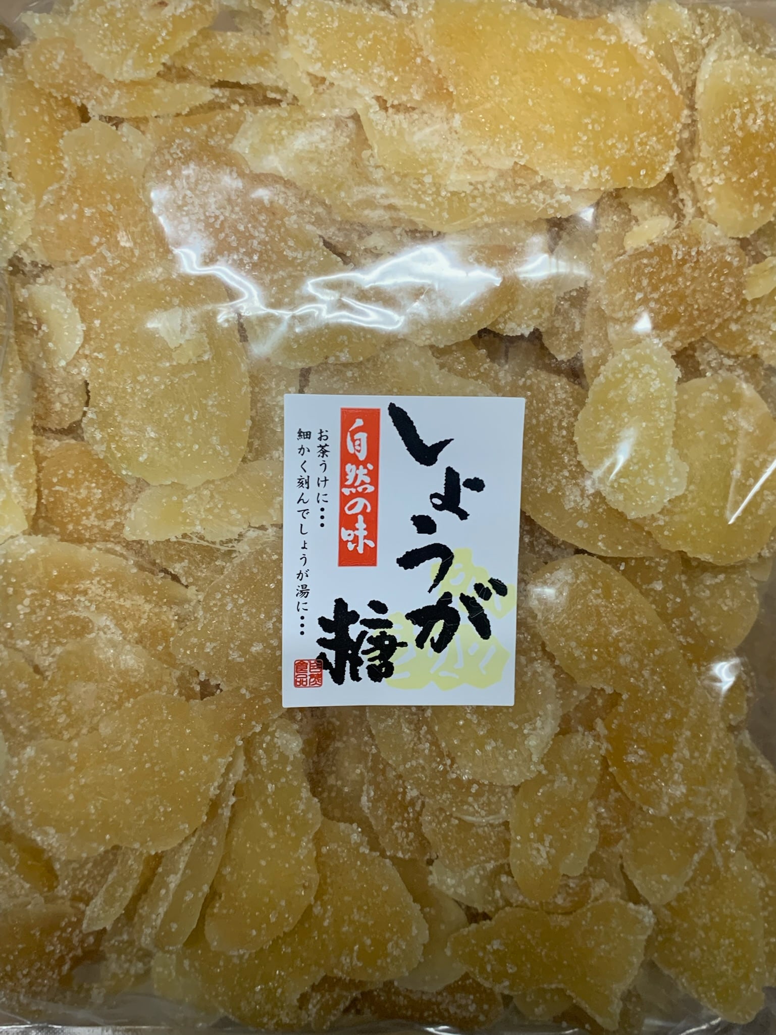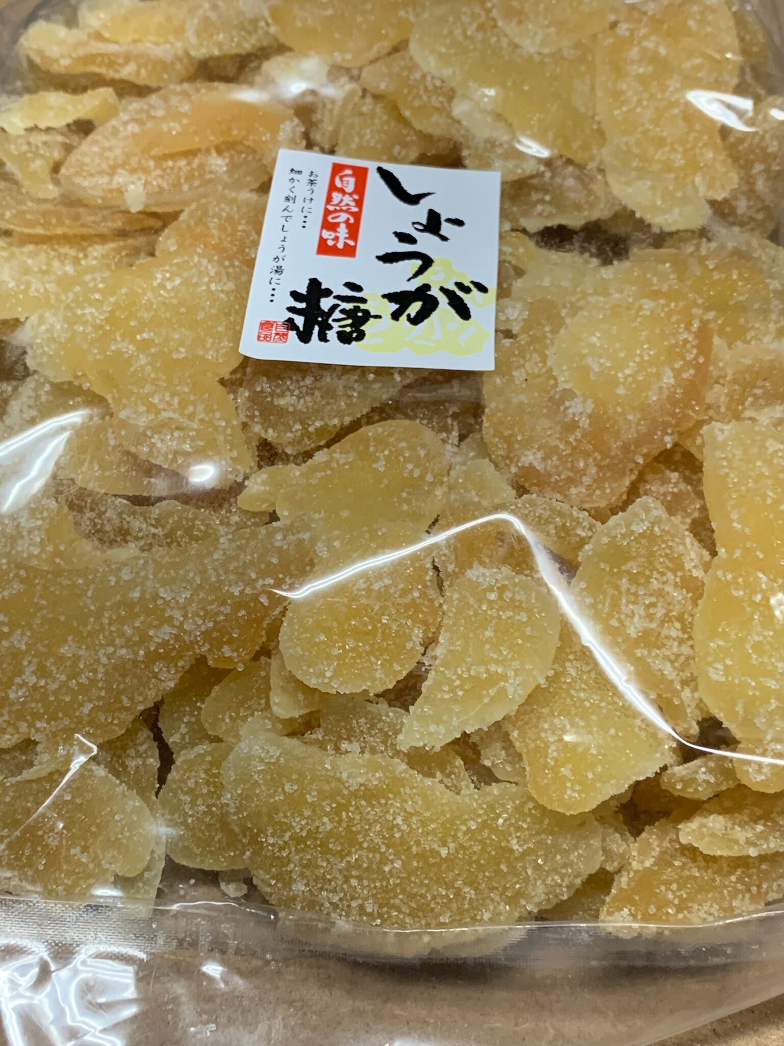 生姜をスライスカットし、表面にザラメをまぶして仕上げた生姜糖です。