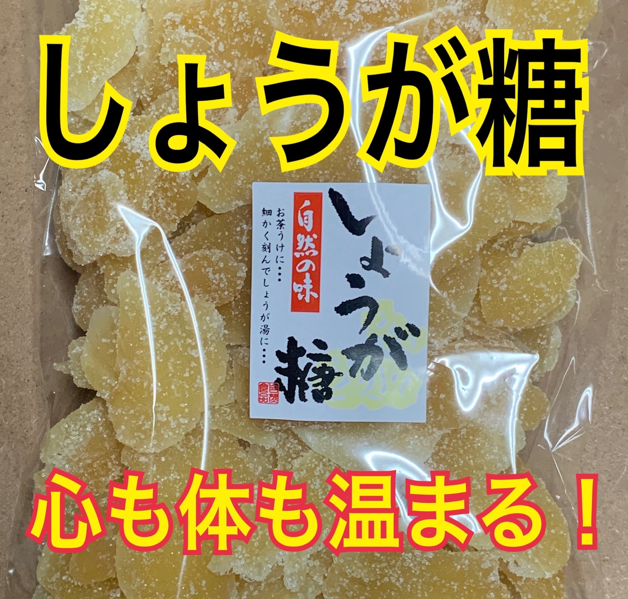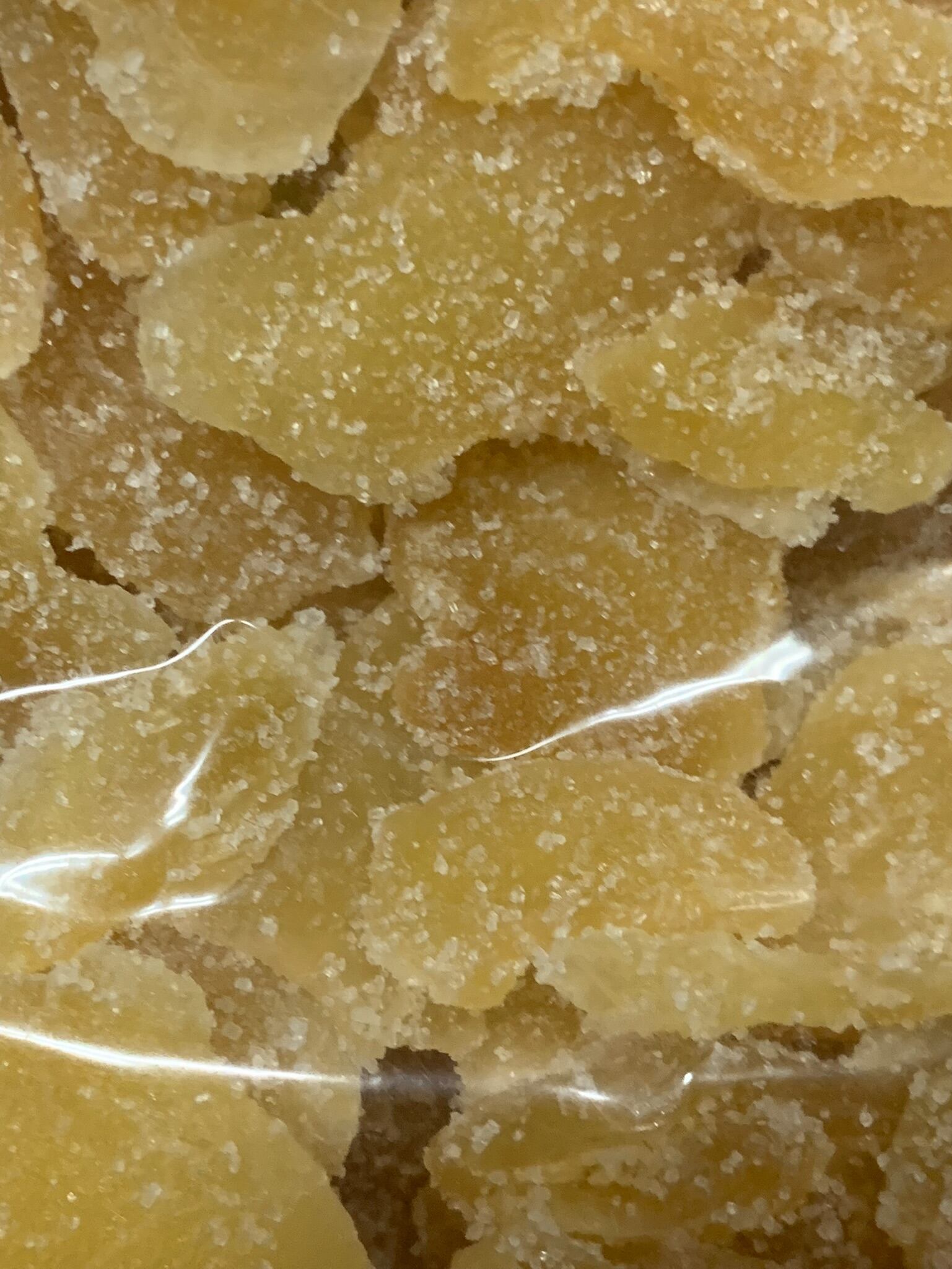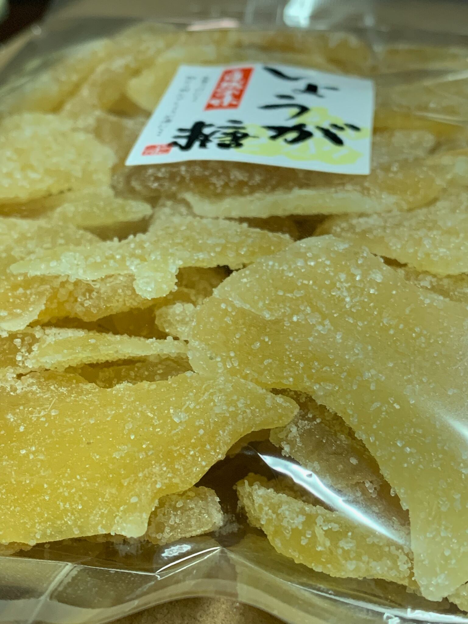 生姜をスライスカットし、表面にザラメをまぶして仕上げた生姜糖です。